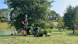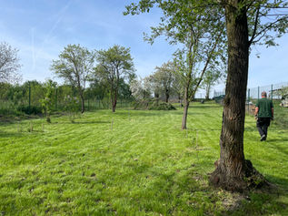 Rekonstrukce starého a zanedbaného pozemku, srovnání terénu, revitalizace a založení trávníku, dosadba ovocného sadu.